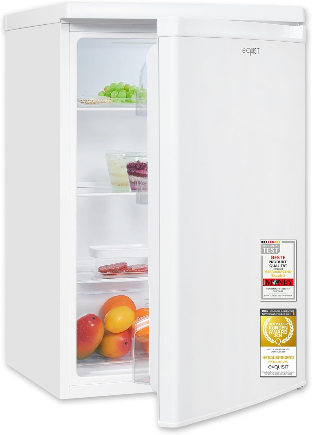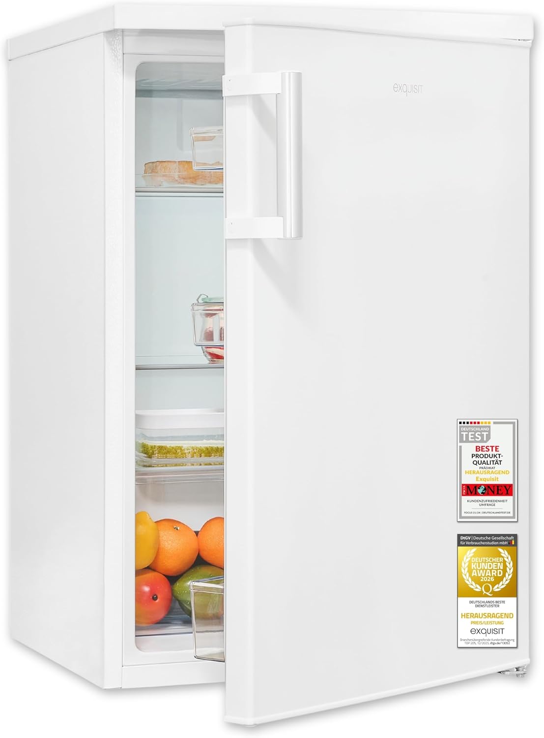 Exquisit Vollraumkühlschrank 127 l Nutzinhalt, Energieklasse E, 39 dB(A) kompakte Bauform, LED-Innenbeleuchtung, manuelle Temperaturregelung, Glasablagen, Gemüseschublade KS516-V-040E weiss