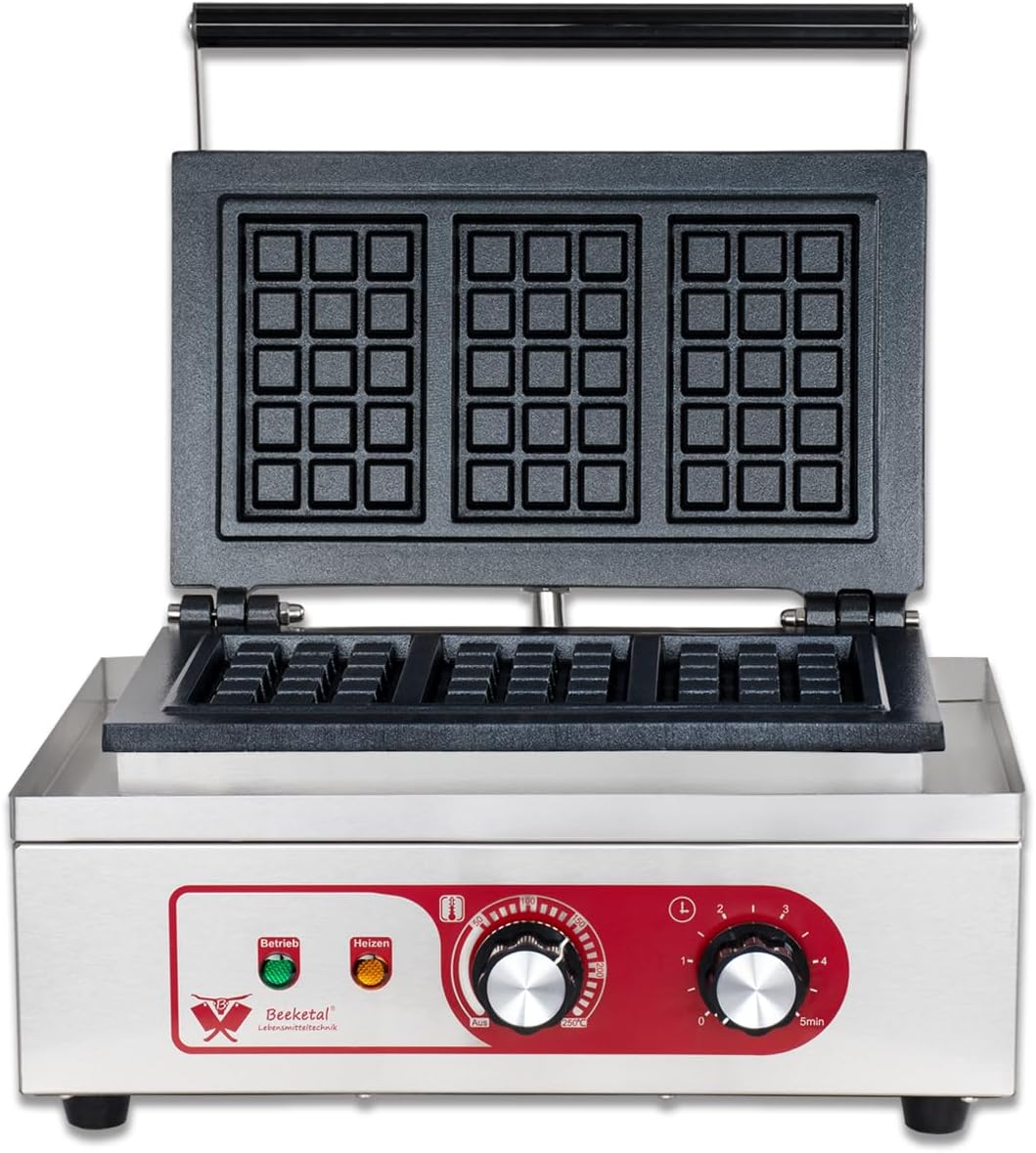 Beeketal 'BBW-3' Gastro Profi Waffeleisen mit antihaftbeschichteten Backplatten (3 geteilt), Waffelautomat für belgische Waffeln mit Edelstahl Gehäuse, 50-250 °C stufenlos