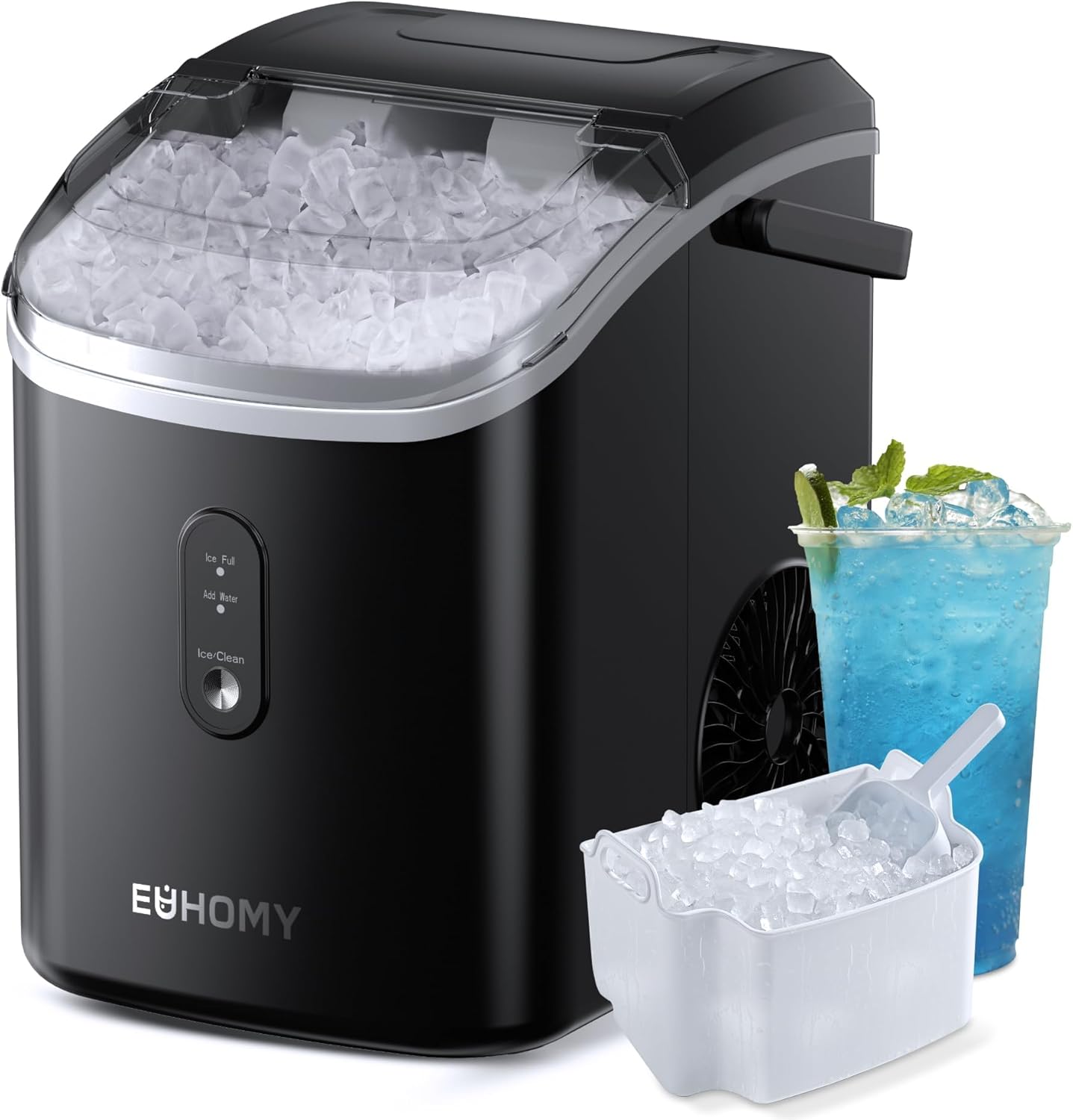 EUHOMY Eiswürfelmaschine, 15kg/24h, Herstellung in 6 Minuten, Crushed Ice Maker, Nuggets Ice, Automatische Reinigung, 120W Tisch-Eiswürfelmaschine, Infrarot-Sensor, Energieeffizient, Schwarz