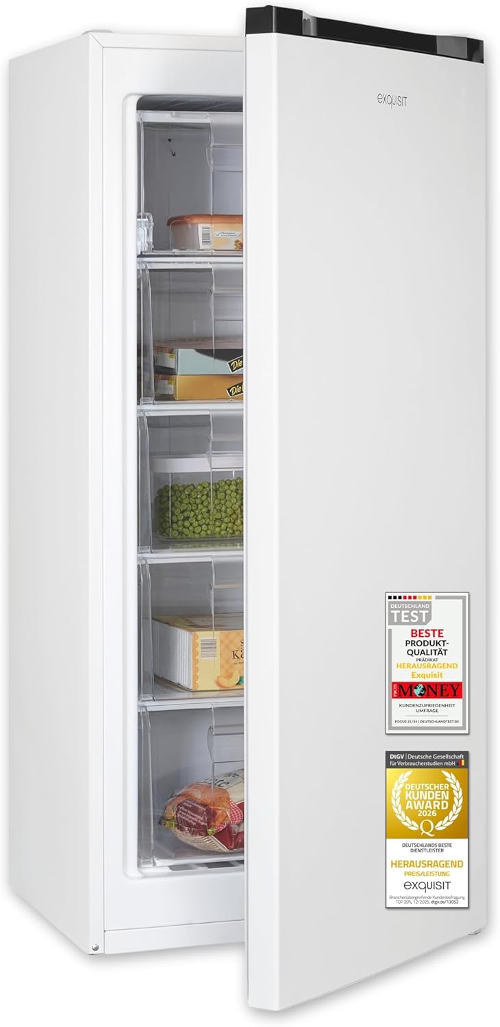 Exquisit Gefrierschrank 145 l Nutzinhalt, Energieklasse C, 39 dB(A) hohe Bauform für mehr Stauraum, 4-Sterne-Gefrieren, manuelle Temperaturregelung, wechselbarer Türanschlag GS5145-050C weiss